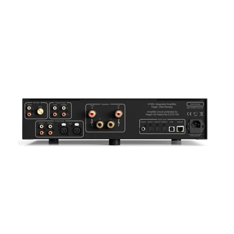 Цифровая секция в Hegel H190v представлена коаксиальным, тремя оптическими и USB-входом. Для сетевого подключения есть порт Ethernet. Аппарат поддерживает воспроизведение файловых коллекций на доступных сетевых устройствах по протоколу UPnP, а также через онлайн-сервисы Spotify и другие. Hegel H190v совместим с Roon, а для подключения iOS-устройств удобно воспользоваться AirPlay. Усилитель имеет гибкие настройки, доступные через выводимые на дисплей меню. Можно установить максимально допустимую громкость звука, перевести вход в режим прямого включения при использовании Hegel H190v в составе домашнего кинотеатра.